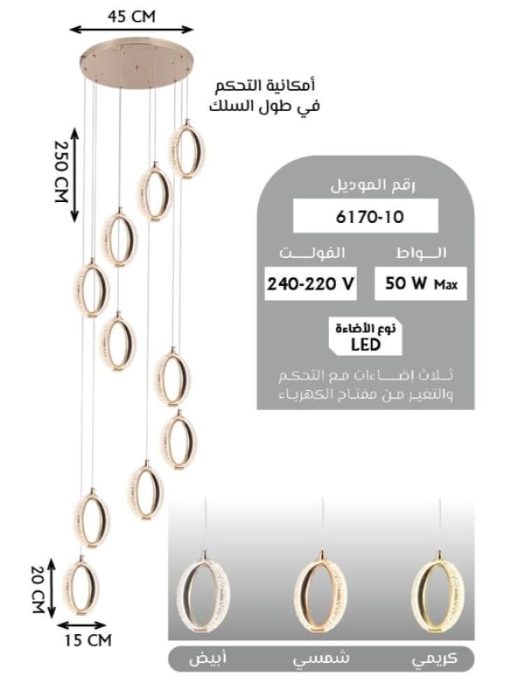 إضاءة LED عالية الكفاءة : تعمل الثريا باستخدام لمبات LED موفرة للطاقة، مما يضمن توفير كبير في استهلاك الطاقة مع إضاءة قوية وعالية الجودة.