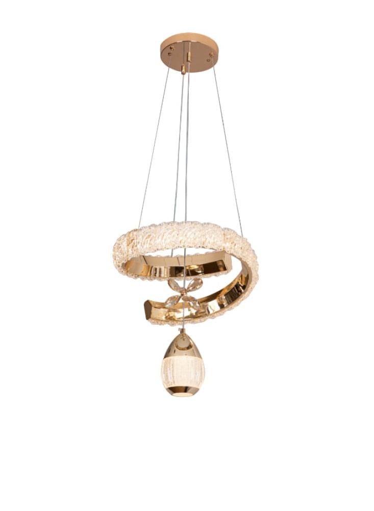 - نجف مودرن بتصميم أنيق : يتميز النجف بتصميم مزين بقطع أكريليك شفافة مع إطار ذهبي أنيق، مما يخلق أجواءً دافئة ولمسة فاخرة.
