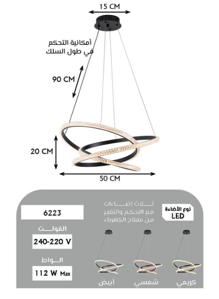 - الأبعاد: قطر الإضاءة: 50 سم \ قطر القاعدة: 15 سم \ طول السلك: 90 سم (قابل للتعديل) \ ارتفاع الحلقة: 20 سم