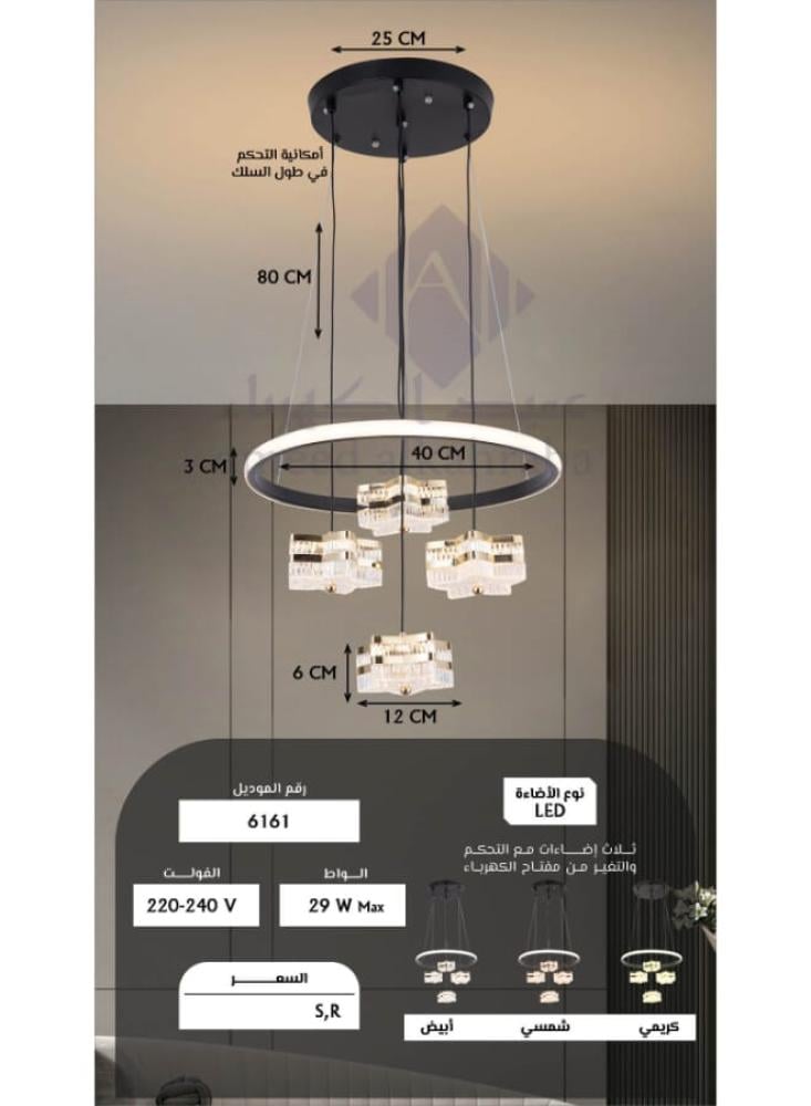 - الأبعاد: قطر الإضاءة: 40 سم \ قطر القاعدة: 25 سم \ طول السلك: 80 سم (قابل للتعديل) \ ارتفاع الحلقة: 3 سم