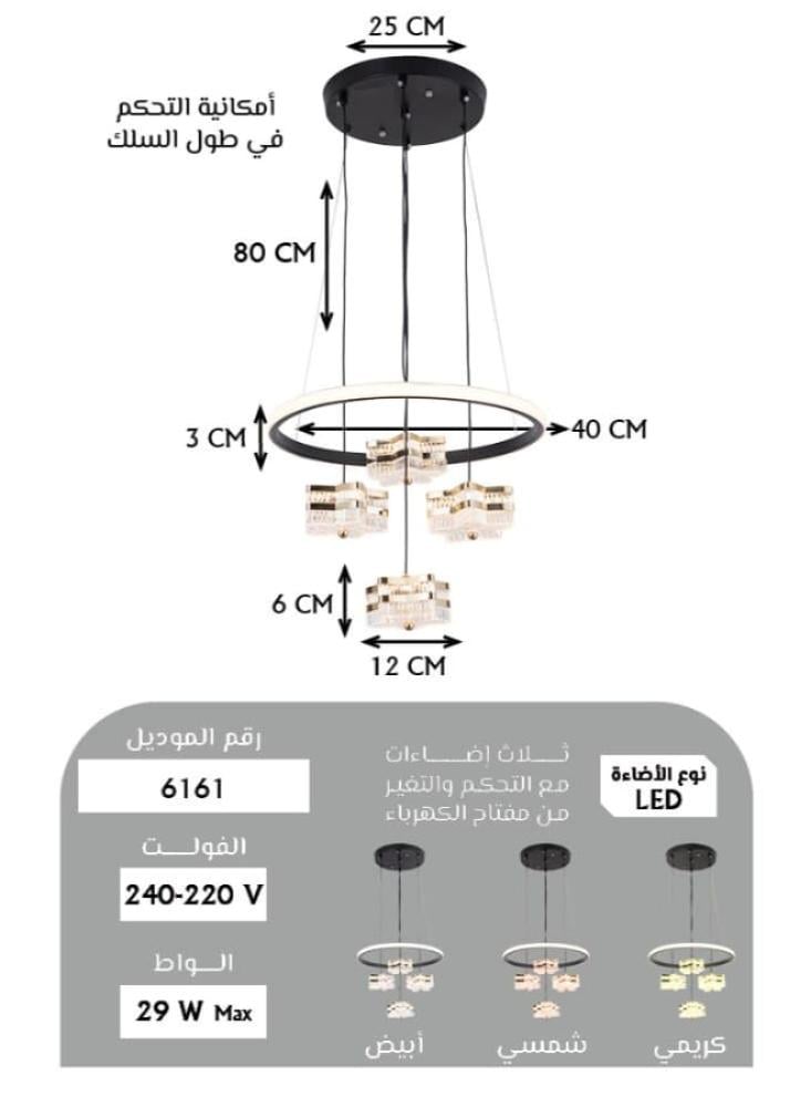 تأتي بميزة فريدة وهي ثلاث مستويات إضاءة (أبيض، أصفر، كريمي شمسي)، مما يمنحك حرية التحكم في جو الغرفة حسب رغبتك. يتميز الإطار بتصميمه الحلزوني الفاخر والمصابيح العلاقية التي تضفي لمسة زخرفية على أي ديكور.