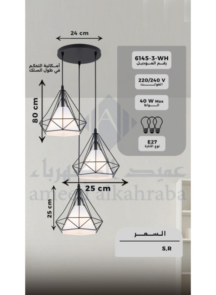 - تصميم مودرن وأنيق : تتميز الثريا بتصميم علاقي مبتكر مع التفاصيل المميزة فيه، ومصنوع من إطار أسود متين، مما يضفي أجواءً دافئة وفاخرة على المساحة.