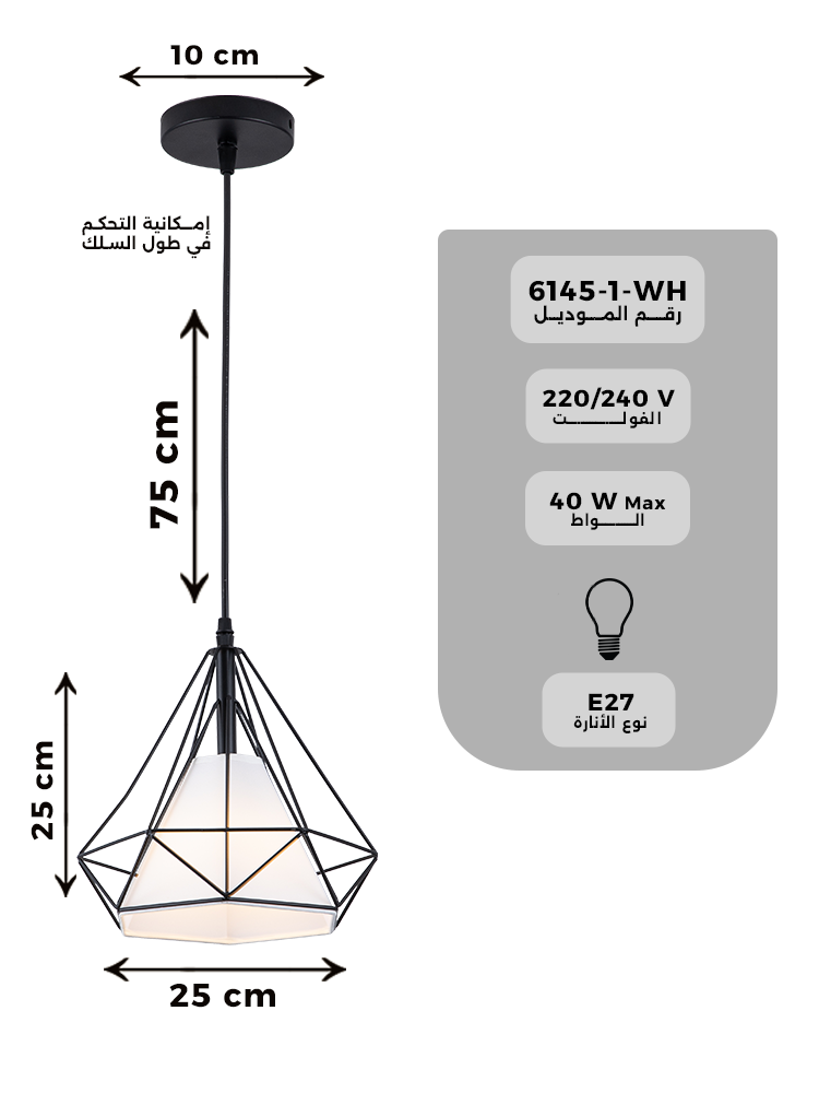 - مقاس الثريا : قطر المنتج: 25 سم / طول السلك: 75 سم (قابل للتقصير) / قطر القاعدة: 10 سم .