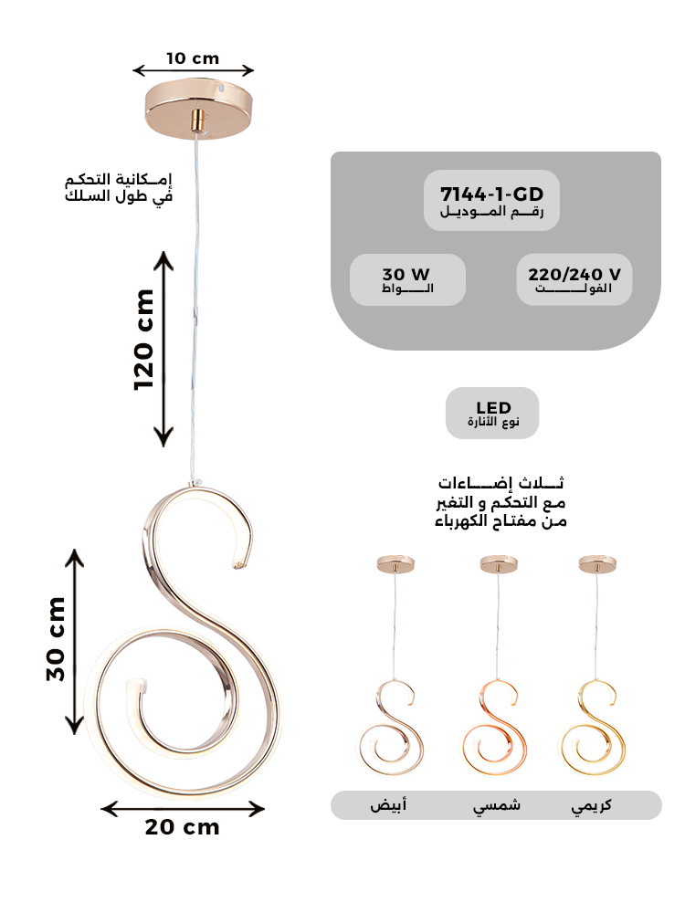 - طول السلك : يصل إلى 120 سم مع إمكانية التحكم في الطول حسب ارتفاع السقف الخاص بك.