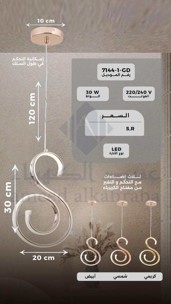 يمنحك عميد الكهرباء ثريا علاقي LED - ذهبي، شكل S حلزوني، طول السلك 120 سم، لمبات LED (30 واط) بتصميم عصري وأنيق. هذه الثريا تجمع بين الأناقة والعملية، مما يجعلها الخيار الأمثل لإضفاء جو من الفخامة على ديكور منزلك.