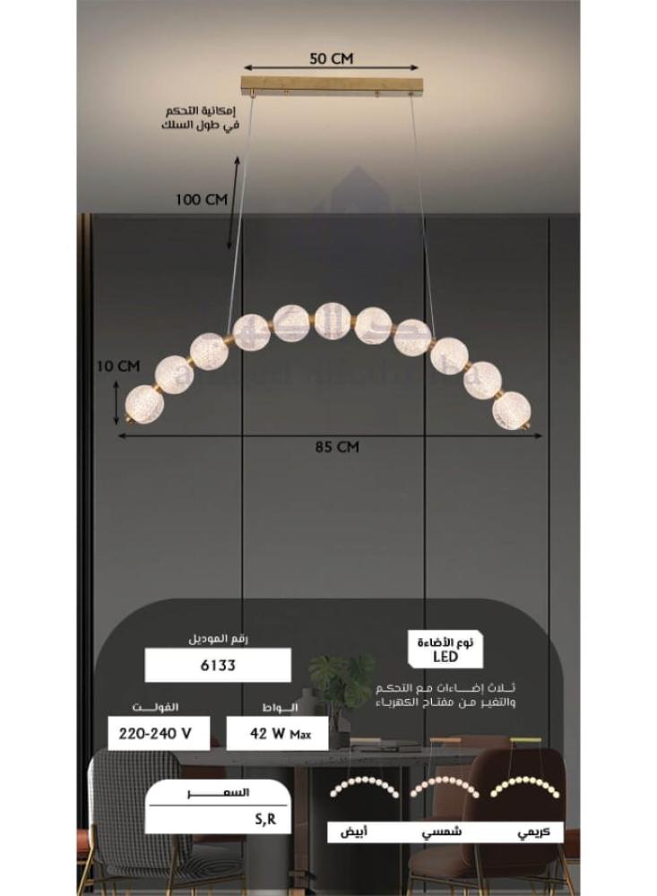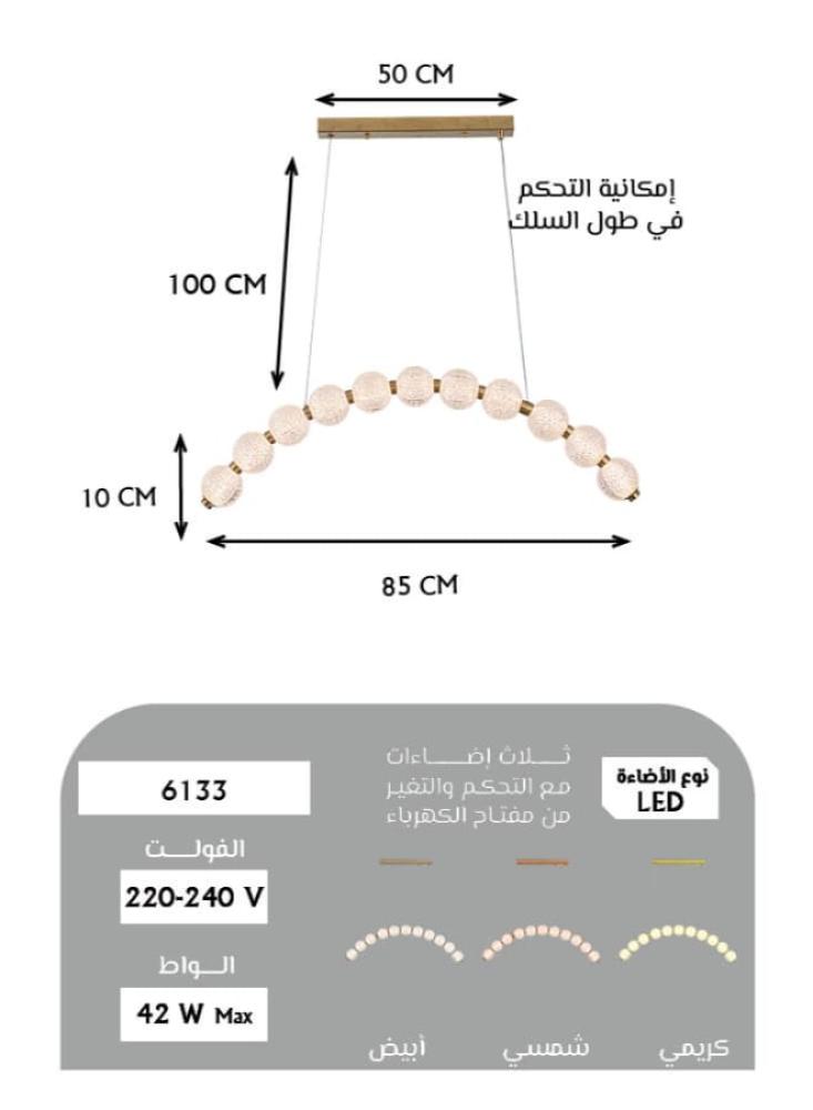 - الأبعاد: قطر الإضاءة: 85 سم \ قطر القاعدة: 50 سم \ طول السلك: 100 سم (قابل للتعديل) \ ارتفاع الحلقة: 10 سم