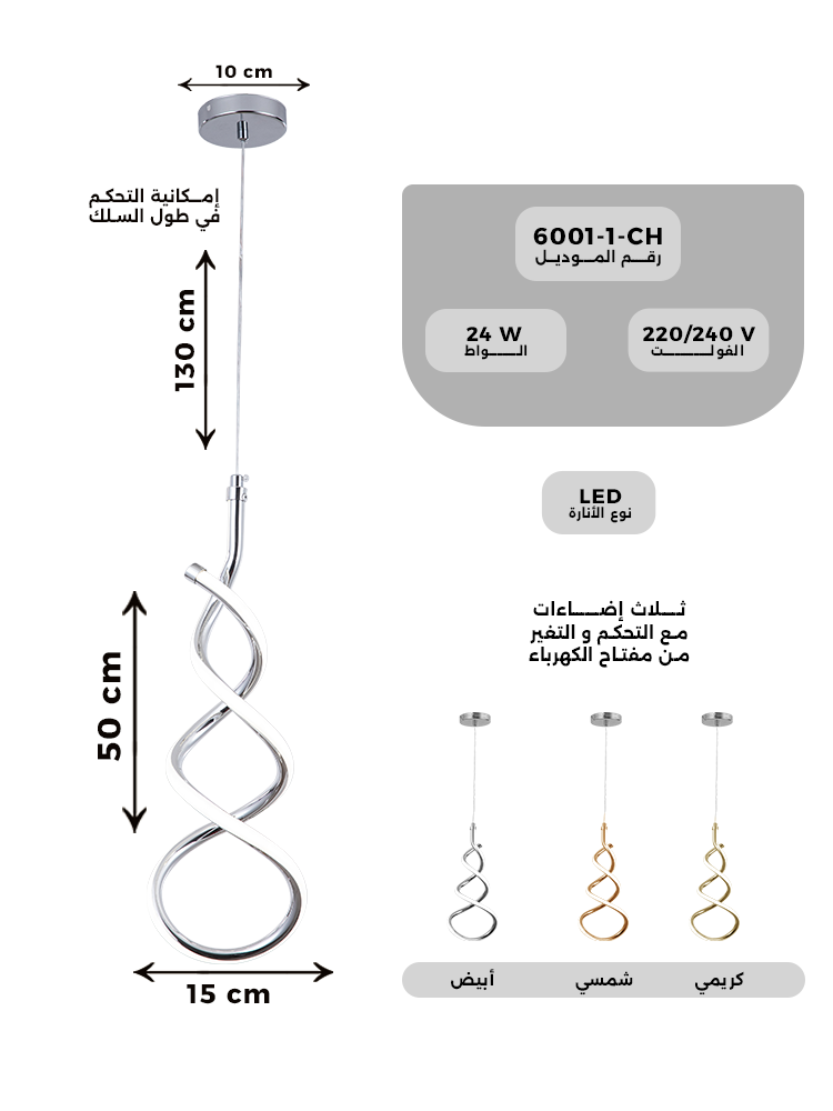 - تصميم فريد : يتميز المنتج بتصميم مميز ومريح للعين، مع إمكانية التحكم في طول السلك لتتناسب مع ارتفاع السقف الخاص بك.
