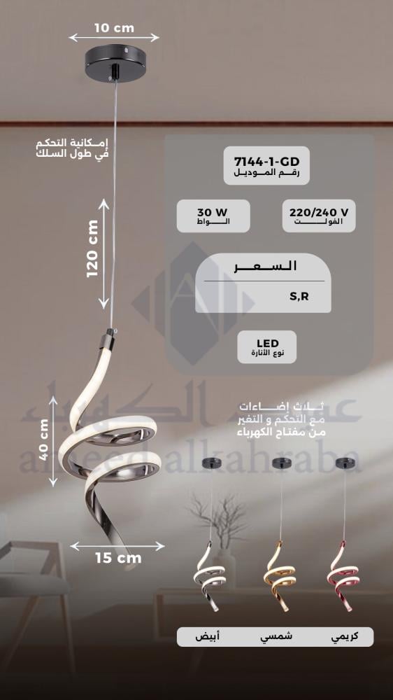 - طول السلك : يصل إلى 120 سم مع إمكانية التحكم في الطول حسب ارتفاع السقف الخاص بك.