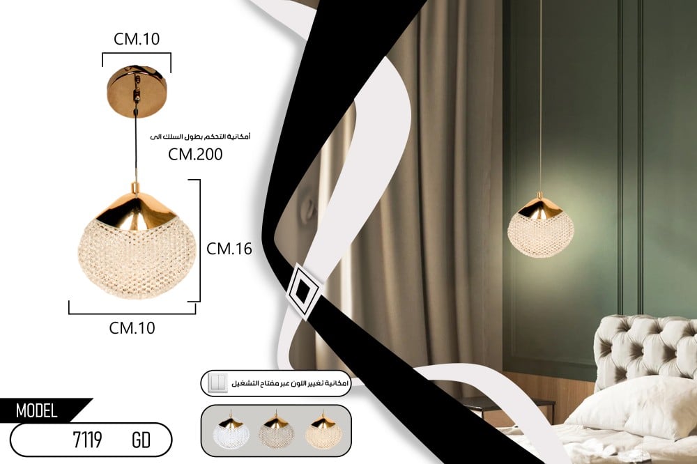 - نوع الإنارة: العلاقي تعمل الثريا باليد LED ثلاث اضاءات (ابيض - كريمي - اصفر)