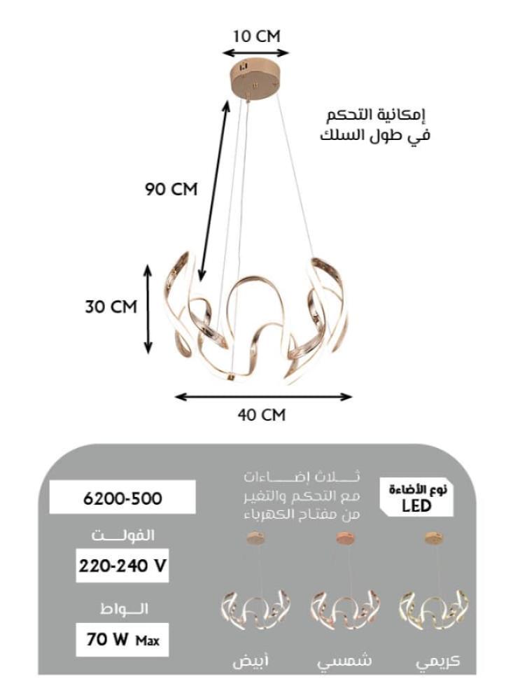 - الأبعاد: قطر الإضاءة: 40 سم \ قطر القاعدة: 10 سم \ طول السلك: 90 سم (قابل للتعديل) \ ارتفاع الحلقة: 30 سم