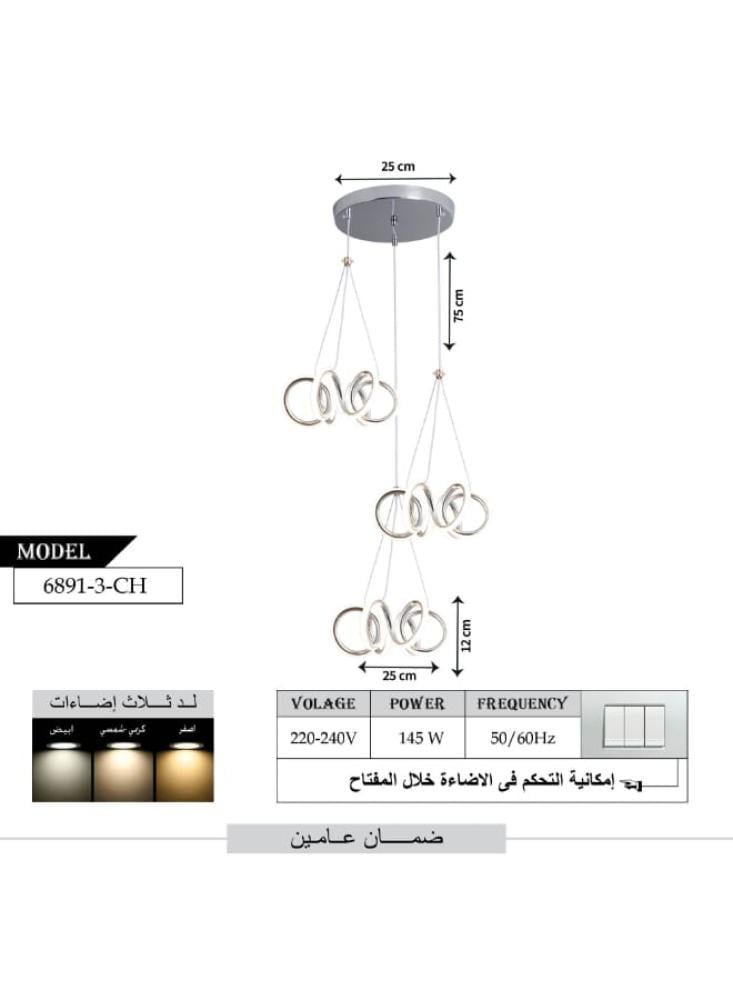 تأتي بميزة فريدة وهي ثلاث أوضاع إضاءة (أبيض، أصفر، كريمي شمسي)، مما يمنحك حرية التحكم في جو الغرفة حسب رغبتك. يتميز الإطار بتصميمه الحلزوني الفاخر والمصابيح العلاقية التي تضفي لمسة زخرفية على أي ديكور.