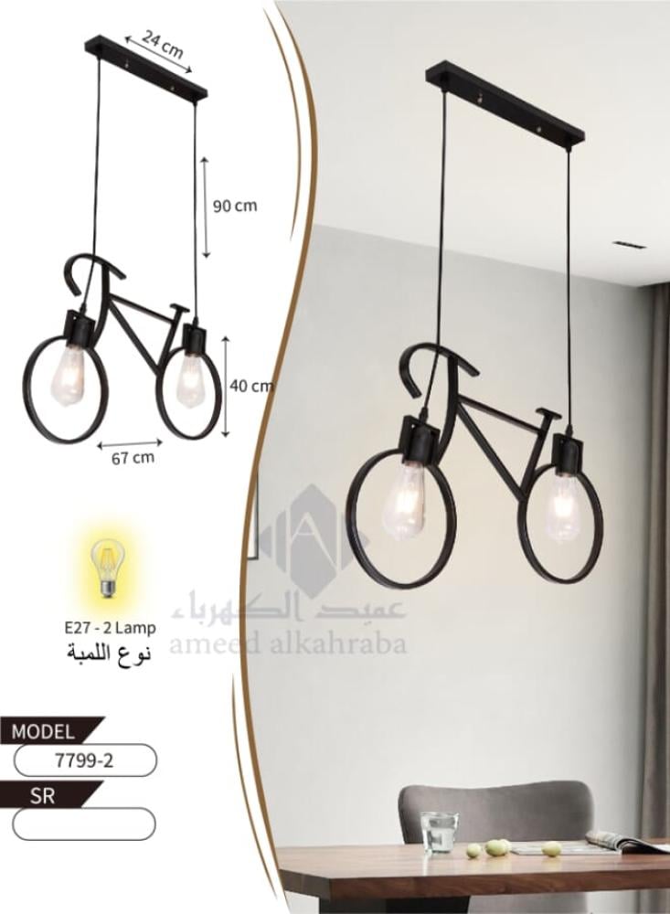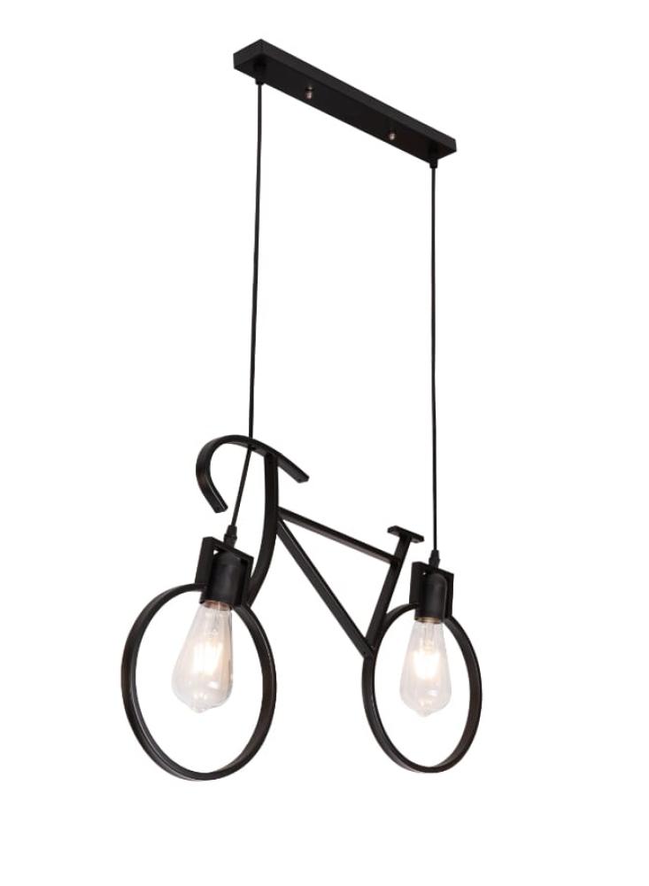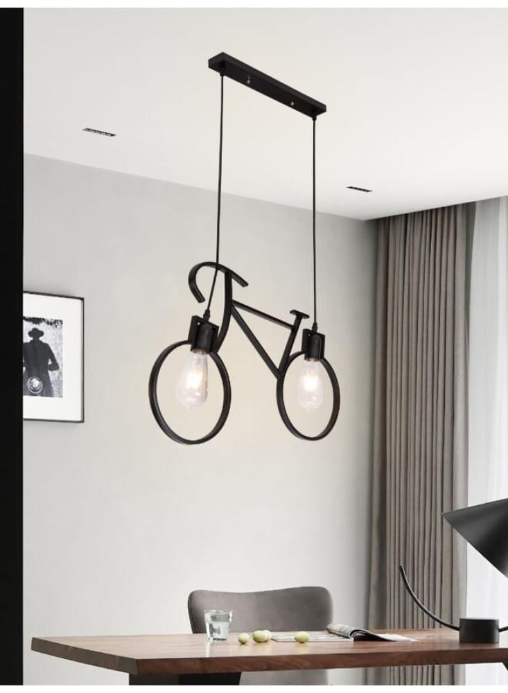 - الثريا مصنوعة من إطار حديدي أسود متين مع تصميم يحاكي شكل دراجة، مما يضفي لمسة من الإبداع والفخامة.