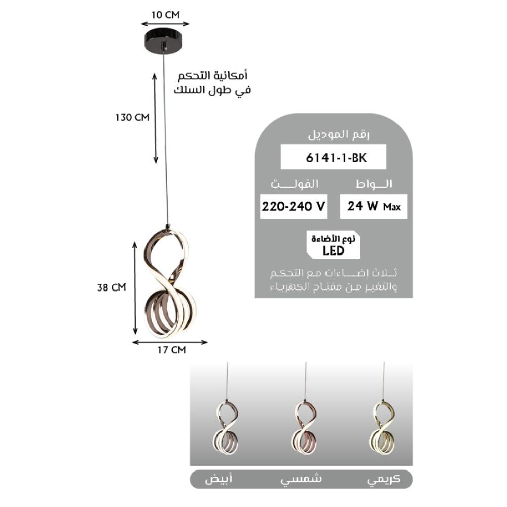 - الأبعاد: طول السلك: 130 سم / ارتفاع الفريم: 38 سم / عرض الإنارة: 17 سم / قطر القاعدة: 10 سم
