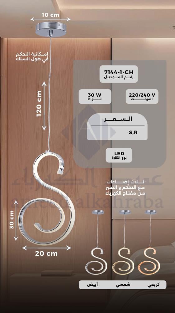 يمنحك عميد الكهرباء ثريا علاقي LED - فضي، شكل S، طول السلك 120 سم، لمبات LED (30 واط) بتصميم عصري وأنيق. هذه الثريا تجمع بين الأناقة والعملية، مما يجعلها الخيار الأمثل لإضفاء جو من الفخامة على ديكور منزلك.