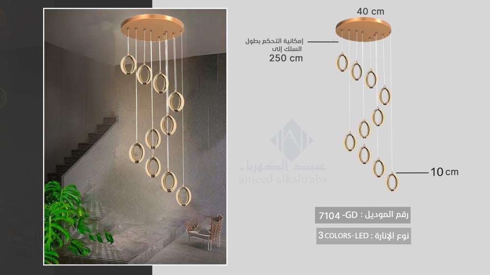 قابلية التحكم في الطول : السلك القابل للتعديل بطول يصل إلى 250 سم (2.5 متر) يتيح لك تعديل ارتفاع الثريا حسب احتياجات الغرفة أو الدرج .