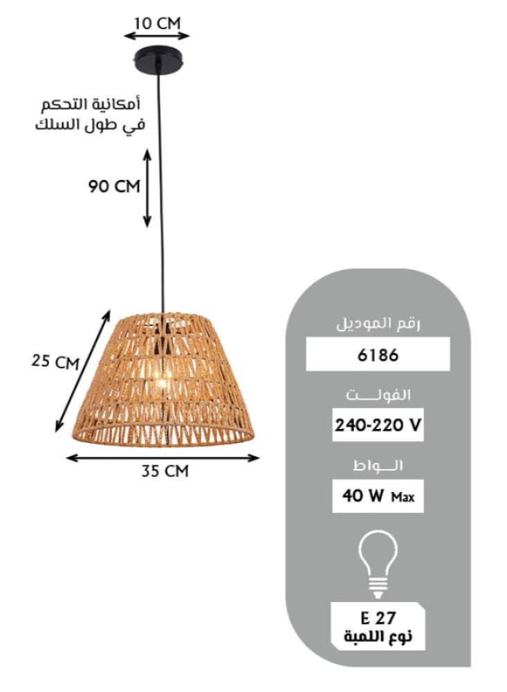 - الأبعاد: قطر الإضاءة: 35 سم \ قطر القاعدة: 10 سم \ طول السلك: 90 سم (قابل للتعديل)