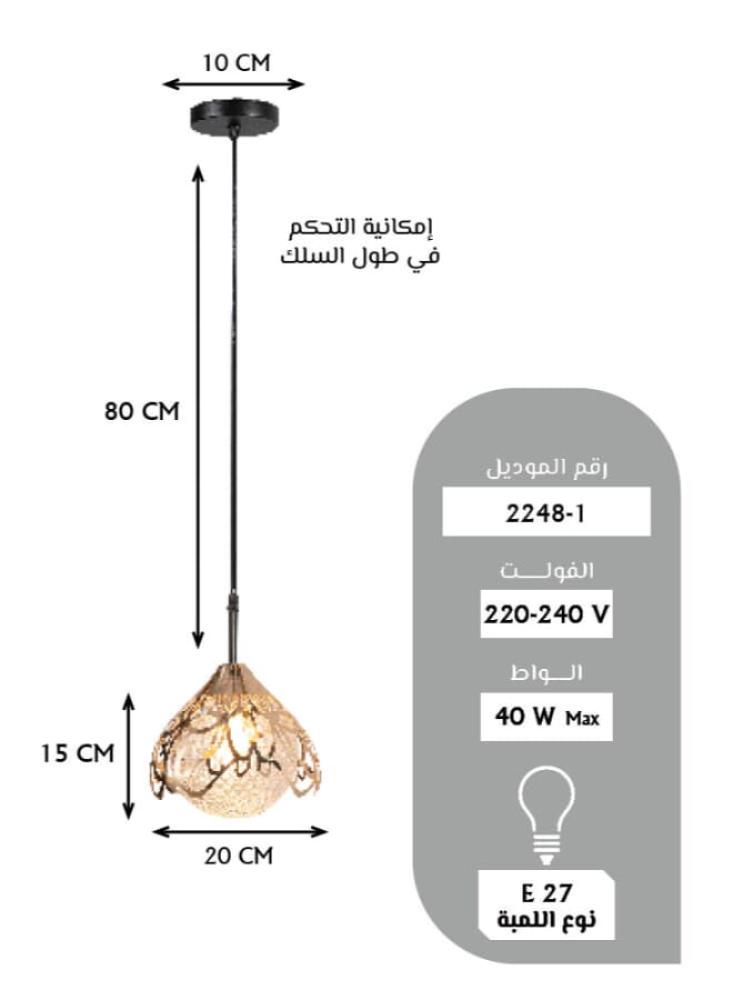 - الأبعاد : طول السلك القابل للتعديل: حتى 80 سم \ قطر المصباح: 20 سم. \ رتفاع المصباح: 15 سم \ مقاس القاعدة: 10 سم.