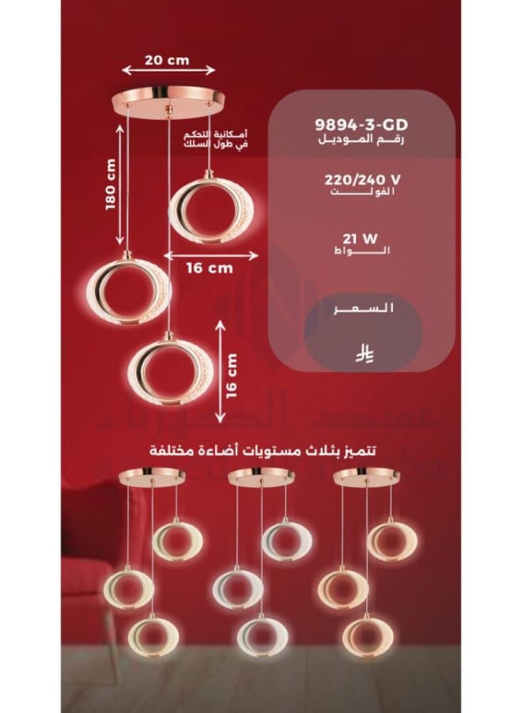- قابلية التحكم في الطول : يأتي النجف بسلك قابل للتعديل يصل طوله إلى 180 سم، مما يمنحك الحرية لضبط ارتفاعه حسب طبيعة الغرفة.