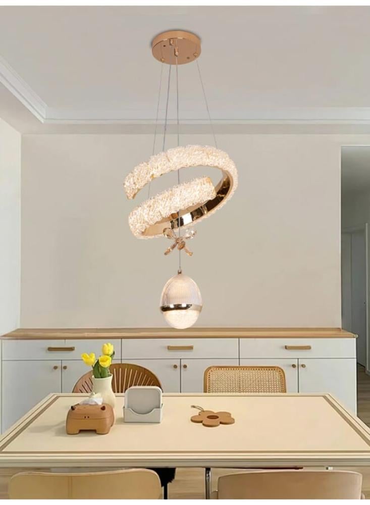 - نجف مودرن بتصميم أنيق : يتميز النجف بتصميم مزين بقطع أكريليك شفافة مع إطار ذهبي أنيق، مما يخلق أجواءً دافئة ولمسة فاخرة.