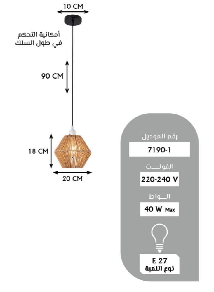 - الأبعاد: قطر الإضاءة: 20 سم \ قطر القاعدة: 10 سم \ طول السلك: 90 سم (قابل للتعديل) \ ارتفاع الحلقة: 18 سم